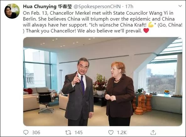第一条是国务委员兼外长王毅会见德国总理默克尔的消息。默克尔表示中国能够战胜疫情,她会一直支持中国,“中国加油”。感谢德国总理的同时,华春莹也表示中国必将取得(抗疫阻击战)的胜利。