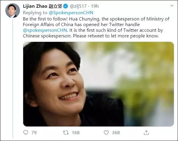 事实上,与国际接轨,也是外交官的标配。去年8月担任新闻司副司长赵立坚,就是个推特达人。华春莹首推下面第一个回复的就是赵立坚。