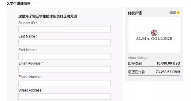 选择学校,填写缴费金额(默认为收款地通用货币)