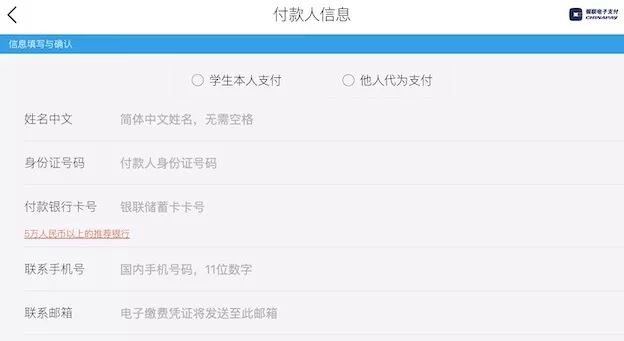 选择“银联卡”为付款方式,填写付款人和学生信息
