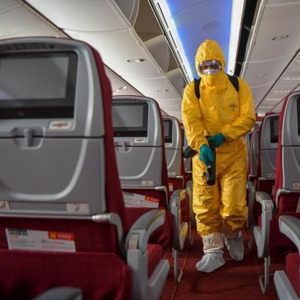 资料图:身着防护服的工作人员对航班客舱进行消毒作业。中新社记者 骆云飞 摄