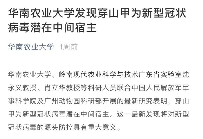 2月7日,华南农业大学微信公号发布消息称,华南农业大学、岭南现代农业科学与技术广东省实验室沈永义教授、肖立华教授等科研人员联合中国人民解放军军事科学院及广州动物园科研部开展的最新研究表明,穿山甲为新型冠状病毒潜在中间宿主。这一最新发现将对新型冠状病毒的源头防控具有重大意义。