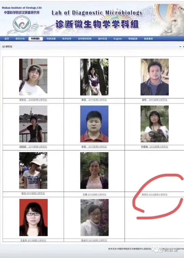 网络流传的截图显示,武汉(新冠)病毒肺炎的零号病人是黄燕玲,系武汉病毒所科研人员,2012年考入武汉病毒所的硕士研究生。