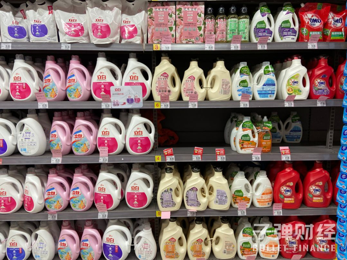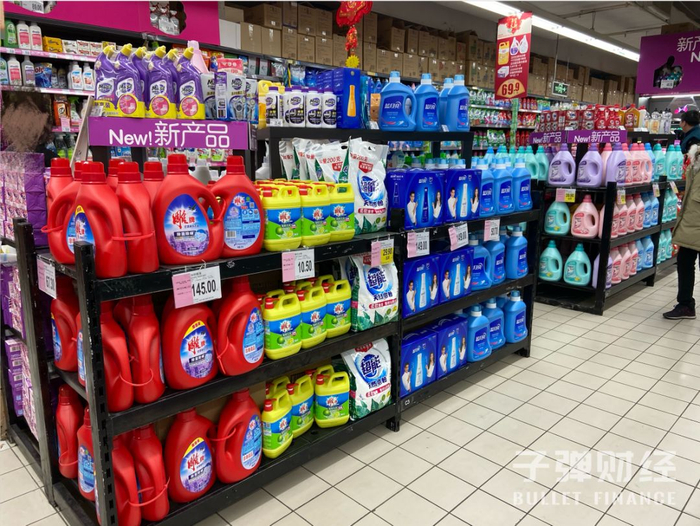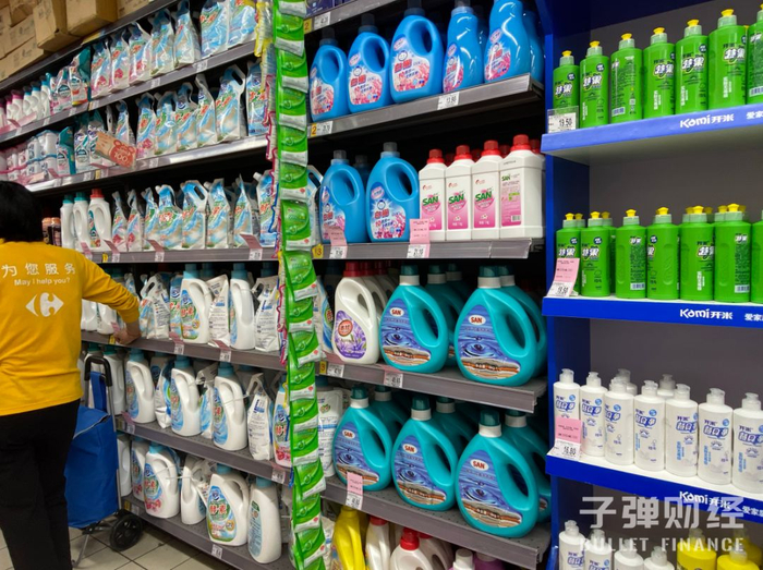 ‘子弹财经’在北京市双井地区的家乐福超市看到,除了前述洗衣液品牌,花王、洁霸、家安、白猫等洗衣液也在货架上占据了不少位置。