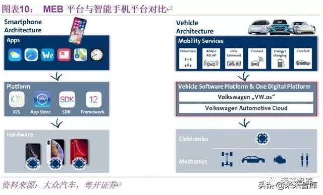 我们从大众官方提供的信息来看,MEB 平台软件架构思路完全摒弃了传统汽车的架构思路,取而代之的是采用了智能手机的格局,即硬件-系统平台-各应用方案的层级结构, 无疑是大众由“硬”汽车向“软”汽车跨出的第一步,作为传统汽车生产厂商来说,是具有历史转折意义的。