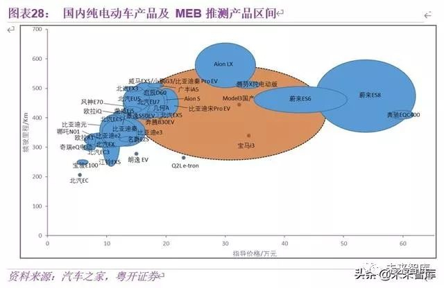 目前国内新能源车方兴未艾,叠加特斯拉国产化带来的“鲇鱼效应”,以及补贴退坡影响,行业面临结构性优化调整。从 2019 年各个品牌的售价和续航里程来看,在售车型大量集中在价格区间 10~15 万、续航里程 300~400Km 和价格区间 15~20 万、续航里程 400~500Km 这两块范围内。在 20 万以上国产车较少,主要是广汽传祺 Aion LX 和造车新势力蔚来的 ES6 和 ES8,以及比亚迪宋 Pro EV 的部分车型;合资车国产化车型较少,主要为 Model 3、宝马 i3、Q2L e-tron 等。我们推测 MEB 系列定价区间主要在 15 万元以上,特别是 15~30 万元区间,会对该区间的自主品牌带来一定冲击,同时确立20~30 万元范围内销量龙头地位,并在此区间内撬动个人家庭用车需求。