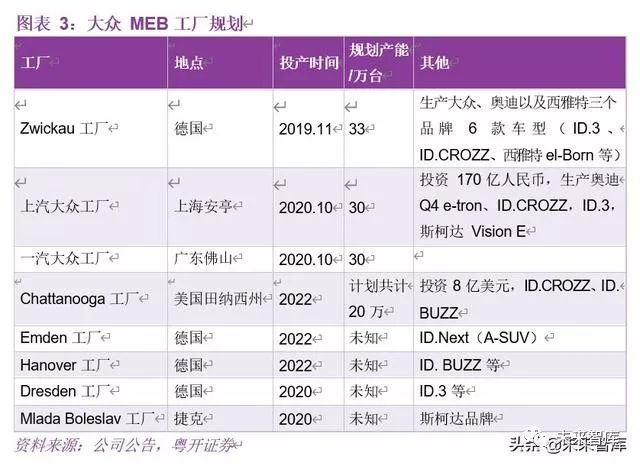 国内来看,2018 年 10 月 19 日,上汽大众安亭新能源汽车工厂开工。作为大众在中国的全球首个新建 MEB 生产基地,该工厂项目总投入 170 亿元,规划年产能 30 万辆。2019 年 11 月 8 日,该新能源工厂落成,首辆 ID.3 车下线,该车也是上汽大众未来投产的首款 ID.家族轿车。2020 年 10 月,上汽大众安亭新能源工厂及一汽大众佛山工厂将正式启动 MEB 平台纯电动汽车的生产,主要用于生产大众、斯柯达、西雅特、奥迪低端车四个品牌车型。综合年产能将达到 60 万辆,最多能达到 70 万辆。