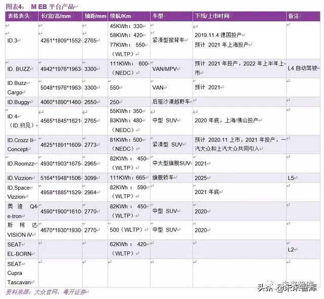 1、完整的产品体系。从当前大众释放的信息来看,MEB 平台作为将来的纯电动平台,基本已经涵盖了所有从 A0 级到 B 级车型,及所有类型:轿车、SUV、MPV、越野车、VAN 等,整个体系已见雏形。MEB 作为专门为纯电动车打造的平台,没有了传统燃油车动力总成的束缚,零件共用性更高,整车空间更大,性能更舒适。