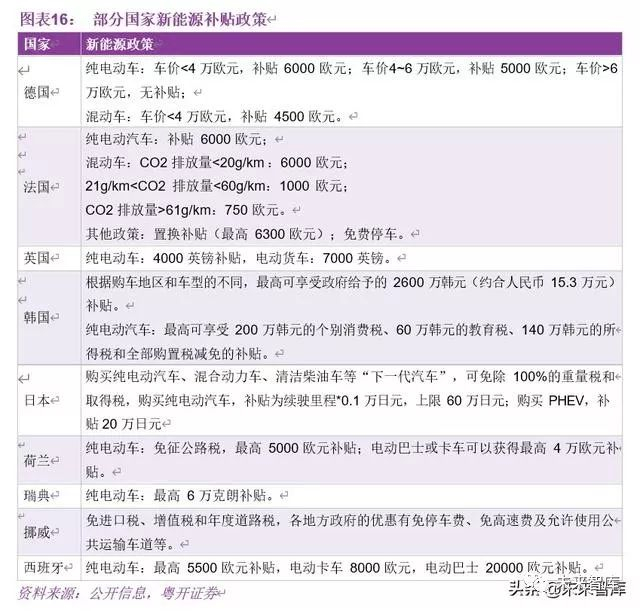欧盟排放法规持续加严,多数车企面临高额罚款,各国纷纷出台各项政策。2020 年1 月 1 日,欧盟委员会针对乘用车和商用货车的新二氧化碳排放法规生效,该法规要求, 相比 2021 年,2025 年二氧化碳排放要减少 15%,2030 年乘用车减少 37.5%,商用车减少 31%。如果按照 2021 年 WLTP 法规要求乘用车小于 95g/Km,那么 2025 年要低于80.75g/Km,2030 年要低于 59.4 g/Km,并且达标要求非常严苛,从 2019 年开始,每超标 1g/Km 将罚款 95 欧元。而 2018 年欧盟内新车平均碳排放量 121g/Km,需要两年时间降低 21%方能达到 2021 年的目标制。所以推广新能源汽车,尤其是纯电动汽车迫在眉睫。