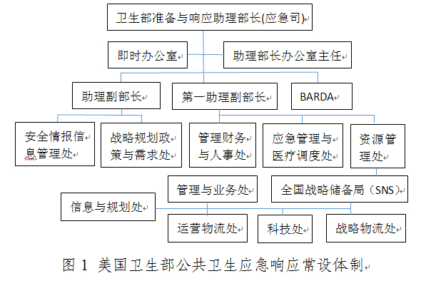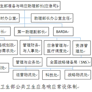 美国政府公共卫生应急响应体制分卫生部应急司和所属的全国战略储备局两层。公共卫生应急与准备事权归属各州,并由联邦政府给予应急响应援助。卫生部负责公共卫生应急的部门是准备与响应助理部长办公室(ASPR,简称应急司),设一名助理部长、两名副助理部长和五大业务处,负责在全境快速部署公共卫生应急战略储备药品与器械(MCM),支持、指导各州与地方有效利用资源,并给出建议,它是美国全国基本药品器械准备与响应的总指挥部。其中在资源管理处下设全国战略储备局(SNS),承担向全国应急地区指定地点投送基本医疗资产使命。参见图1。