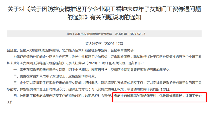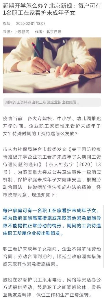 日前,北京已经从学生安全和学习的角度出台了《关于因防控疫情推迟开学企业职工看护未成年子女期间工资待遇问题的通知》政策,明确每户家庭可有一名职工在家看护未成年子女,视为政府实施隔离措施或采取其他紧急措施导致不能提供正常劳动的情形,期间的工资待遇由职工所属企业按出勤照发。