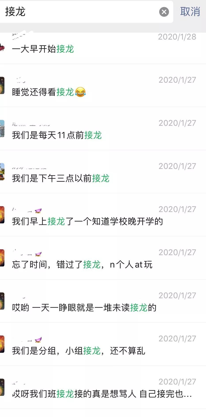 于是家长群里就出现了“如果错过了接龙,被N个人艾特”、“看到接龙想骂人”……这样的吐槽。