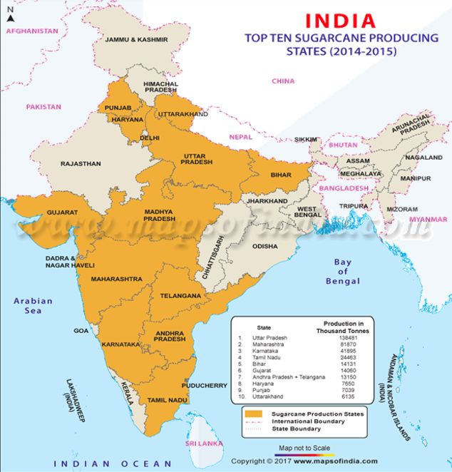 结合印度行政区域图和印度甘蔗种植区域分布图,可以看出,距离巴基斯坦的北方邦易受到蝗灾的影响,而该邦糖产量占印度糖产量近50%。