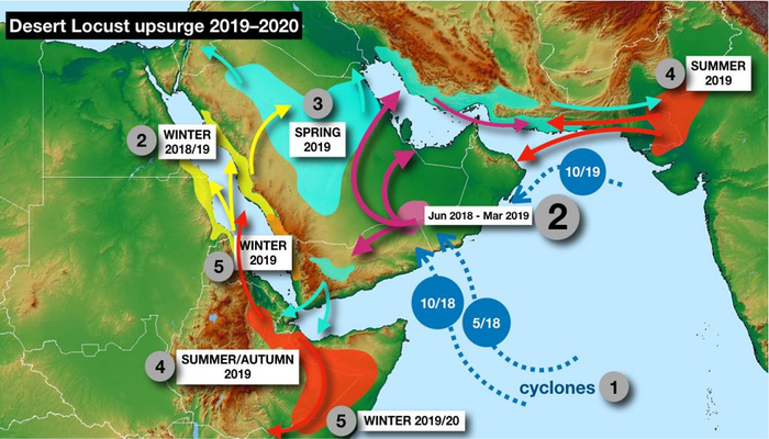 东非在2018年5、10月以及2019年频繁出现暴风雨天气,地区植被生长快且含水量增加,这给蝗虫充分的生长环境,沙漠蝗虫群成倍增加。