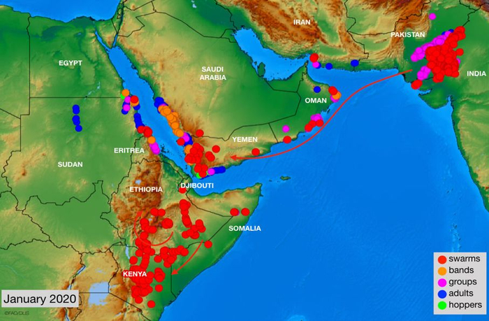 据联合国粮农组织分析,现有蝗虫的幼虫将于2月初孵化,4月初形成新的蝗群。如不尽快阻止将会持续制造灾祸直到六月,届时蝗虫数量可能将再增长500倍。