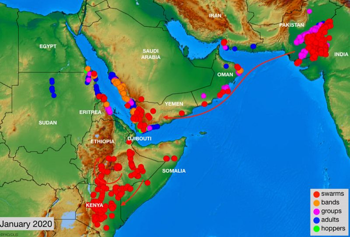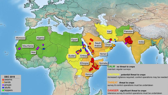 据了解,2019年1月,沙漠蝗群从苏丹和厄立特里亚飞越红海,2月到达也门、沙特阿拉伯和伊朗,于3月到达巴基斯坦西南部,6月到达中北部,对上述国家造成严重危害并积累了较高的虫源。受雨量充沛和季风时间长等因素影响,当前东非、西亚及南亚国家正遭遇历史罕见的蝗虫灾害,索马里、巴基斯坦等多国宣布进入紧急状态,应对蝗虫灾害。