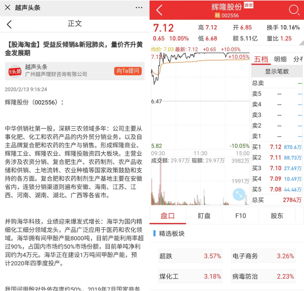 而在本号2月13日《受益疫情&反倾销,外有需求爆发,内有并购重组,农业股超级风口找到了》一文中,我们提到辉隆股份(002556)同时受益多重利好,当日逆势飘红,经过适当的调整蓄力后,于今日再次上冲涨停,成为盘面亮点。