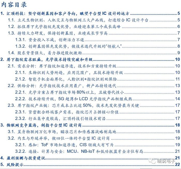 自成立以来,公司出现三次业绩高峰,均受益于领先的产品技术和率先量产的出货能力。2012年智能手机市场快速发展,公司电容屏触控芯片销量迅速提升;2016年公司活体指纹识别技术突破,得到众多客户认可并量产出货;2019年公司屏下光学指纹技术行业领先并率先规模量产。目前公司发力物联网,打造Sensor +MCU+Security+Connectivity芯片设计综合平台,有望实现技术和业务的再一次跃升。由于技术外部性,先发优势是IC设计厂商重要竞争力之一。我们认为,从发展历史、研发投入力度及投入方向看,公司兼具“创新基因”和前瞻性布局能力。CEO张帆表示,公司对未来IoT产品的规划是愿意用10年的努力建设一个有综合竞争力的平台,耐心持续投入。