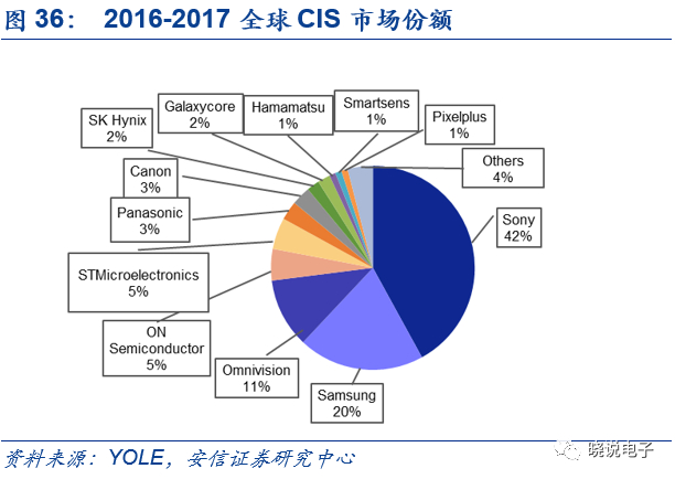 CIS市场空间巨大,且竞争格局高度集中。根据Yole Development,2017年全球CIS芯片产值139 亿美金,同比增长20%,2018~2023年5年CAGR仍将保持在9%左右,预计2023年达到214亿美元。目前CIS行业三强争霸,日本索尼、韩国三星和中国豪威(韦尔收购)三家厂商占据行业第一梯队位置。根据 Yole 最新报告数据,2017年合计市占率达73%。