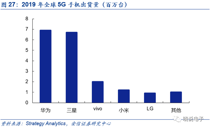 此外,围绕5G手机的超薄屏下光学指纹需求提升,2019年Q4开始配合5G手机的发布已经开始批量出货,预计成为2020年屏下光学指纹行业新的增长动能。随着5G商用,5G手机由于需要容纳更大容量的电池,以及设计更复杂的天线,留给指纹识别或其他部件的空间更小,内部结构和技术性能的变化要求屏下指纹模组更小和更薄,因而超薄屏下光学指纹将是主流方向。根据汇顶科技公告,公司已开发出具有竞争力的超薄屏下光学指纹方案,并于2019年Q4量产出货。根据Strategy Analytics数据,截至2019年底,全球5G手机出货量达到1870万台,整体渗透率不足2%。其中华为、三星、cico、小米和LG的5G出货量依次为690万台、670万台、200万台、120万台和90万台,市占率依次为37%、36%、11%、6%和5%。根据工信部数据,截至2019年底,我国5G基站数量达到13万站,预计2020年有望新增60万站以上。根据IDC统计,我国智能手机出货量占全球四分之一,本土安卓系品牌华为、OPPO、vivo和小米合计市占率约70%,我们认为2020年随着5G基站的进一步深度覆盖,延续终端厂商5G新机持续发布的趋势,5G智能手机渗透率有望达到10%,出货量超过1亿部。由于5G超薄屏下光学指纹方案为新技术,市场竞争弱,芯片单价和毛利率较第一代更高,因而对具有技术先发优势的厂商形成利好。