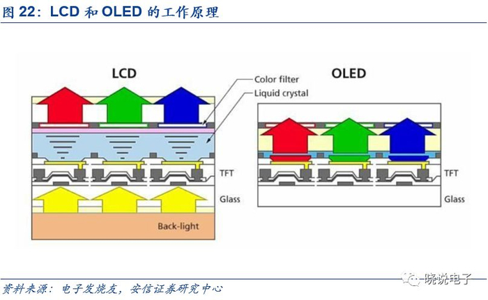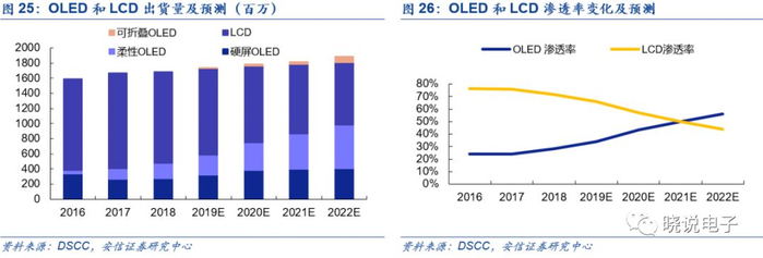 OLED面板性能更优,但受限于量产成本问题,渗透率低于LCD。根据DSCC,2018年OLED和LCD的渗透率分别为28.4%和71.6%。未来成本下探有望加速渗透。根据PIDA(台湾光电科技工业协会),2020年初5.75英寸OLED面板成本已降至6英寸LCD面板的水平,约15~18美元。