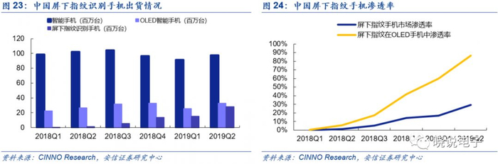 目前屏下指纹识别在安卓的旗舰机和高端机中都已经成了标配,中低端市场也在加速渗透。根据芯智讯,2018年屏幕指纹模组总出货量达到3000万片。IHS Markit预计,2019年屏幕指纹出货量预计增长6倍达到近1.8亿片。据CINNO Research,2019年上半年,中国市场共销售搭载屏下指纹技术的智能手机4390万台,出货量前五名依次为OPPO、华为、vivo、小米、魅族,其中OPPO以1880万台高居第一。据IDC数据,2019上半年,中国智能手机出货量为1.8亿台,经测算可得中国屏下指纹手机渗透率为24%。因此当前屏下指纹渗透率较低,未来增长空间巨大。从进度上看,由于屏下指纹模组价格持续下探,目前已经在千元低端机型中开启应用,因而渗透进展有望进入加速度。