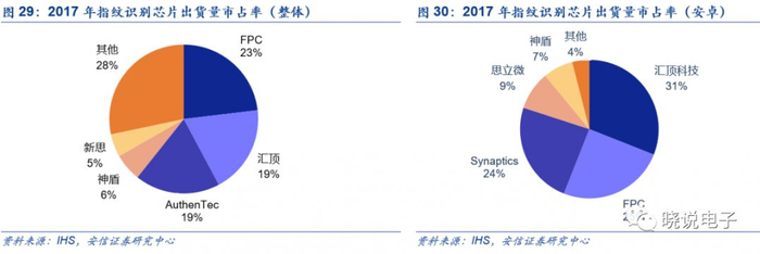 2017年底,新型屏下指纹产品相继量产出货,Synaptics、汇顶科技、思立微和神盾为主要参与者。其中汇顶科技凭借技术先发优势和大客户资源,市占率稳居前列。在2017年2月西班牙MWC大会上,汇顶科技率先展出全球首款屏下光学指纹demo;2018年一季度,汇顶科技的屏下光学指纹芯片实现了规模量产和商用,先后被vivo、华为、小米、OPPO、一加、联想等知名终端品牌全面引入,2018年出货量稳居第一。