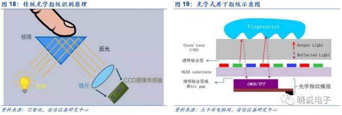 光学指纹识别技术历史最久远,最早在考勤机、门禁等就已广泛使用。它主要利用光的折射和反射原理,将手指放在光学镜片上,内置光源从底部经棱镜射出光线,在手指凹凸不平的线纹形成差异化的折射角度和明暗不同的反射光线,棱镜将其投射在电荷耦合器件(CMOS/CCD)上,形成脊线数字化的、可被算法处理的图像电信号,然后经由处理器芯片进行指纹的对比与验证。此前由于光学传感器体积过大,此前一直无法应用到手机。2016年以来新思和汇顶等芯片商相继发布新一代光学指纹识别方案,同样基于光的折射和反射原理,叠加小孔和透镜成像功能,实现小型化和高精度。