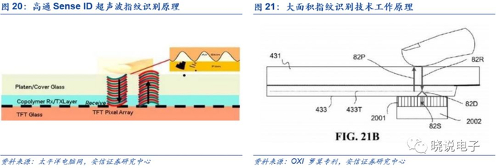 TFT光学大面积指纹识别技术原理为将整张TFT(Thin Film Transistor,薄膜晶体管)光学传感器贴合在OLED屏幕下方,通过光线感应实现指纹识别,由于薄膜的面积可以做得很大,因而能够满足大区域甚至全屏幕指纹识别。缺点在于技术工艺尚不成熟,除了TFT光学传感器的贴合问题,还要相应的软件驱动配合。因而目前仅在小米、OPPO 和vivo 等少数概念机型中使用。上海OXI(箩箕)是该技术主要供应商。