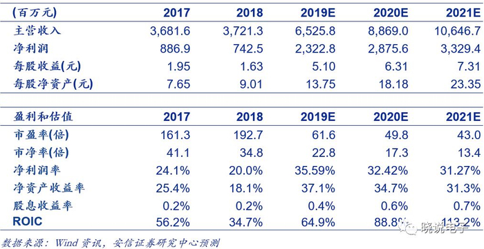 投资建议:我们预计公司2019年~2021年的收入分别为65.26亿元(+75.36%)、88.69亿元(+35.91%)、106.47亿元(+20.04%),归属上市公司股东的净利润分别为23.23亿元(+212.84%)、28.76亿元(+23.80%)、33.29亿元(+15.78%),对应EPS分别为5.10元、6.31元、7.31元,对应PE分别为62倍、50倍、43倍。首次覆盖,给予“买入-A”投资评级。
