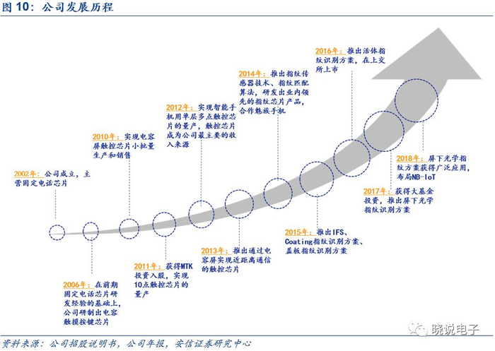 公司于2002年成立,于2016年上市,是一家基于芯片设计和软件开发的整体应用解决方案提供商。目前产品以生物识别(屏下光学指纹芯片和传统电容芯片)和人机交互(触控芯片)为主,已成长为全球主流屏下光学指纹芯片供应商。面向未来,公司战略目标是成为一家综合型的IC设计公司,围绕“物理感知、信息处理、无线传输、安全”四大领域打造IoT综合平台,从传感器到MCU、连接、安全,塑造更多产品和技术的组合,物联网将成为与生物识别、人机交互并行的第三大产品线。