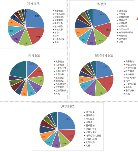 科技龙头指数行业相对集中,前三大行业中电子制造(25.8%)、计算机应用(18.8%)、光学光电子(12.3%),合计占比接近56.9%。科技100指数行业分布相对分散,前三大行业中电子制造(12.5%)、化学制药(10%)、计算机应用(9.6%)。该指数细分较多,其他分类占比22.2%新兴科技100指数前三大行业中电子制造(22.0%)、计算机应用(16.8%)、互联网传媒(12.3%)。该指数中互联网传媒占比较高。深圳科技指数的行业倾斜度较高,前三大行业中电子制造(24.8%)、通信设备(12.6%)、汽车整车(9.6%)。较其他4只,深圳科技指数汽车整车占比较高。