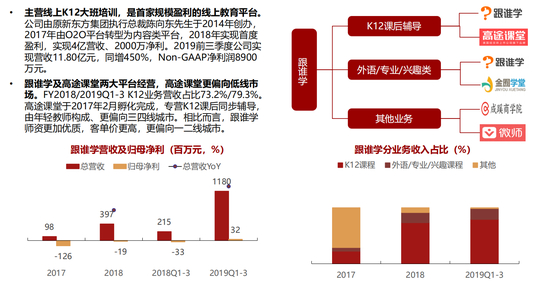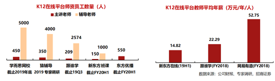 • 伴随业务增长,师资团队拓张速度较快,考验规模化的师资培训与辅导运营能力。以跟谁学为例,2018- 2019Q3,主讲老师新增46人,辅导老师新增2000人。东方优播全职教师数预计从20H1的550人增至20H2的1200人。