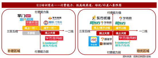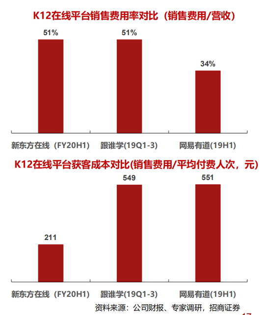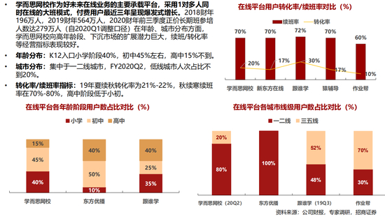 • 从线下走向线上:新东方、好未来两大线下龙头机构进军线上,拥有线下积累的师资力量及品牌优势,在线上竞争中获客成本较低且K12业务续班率较高。此外还有立思辰(诸葛学堂)、思考乐等线下机构也在积极布局线上。