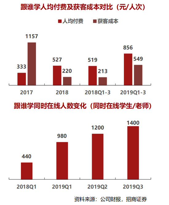 • 双师大班模式,教师运营杠杆高。截止2019年前三季度,公司以209名全职老师带动109万付费人次,K12班课同时在线人数高达1400人/课,名师课程同时在线人数达2000+人,全年毛利率接近75%;