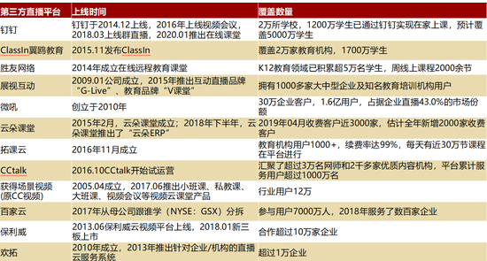 ◆ 在线课堂:公立学校合作直播云平台、在线学习平台等相继上线据教育部,国家网络云课堂(www.eduyun.cn)以部编教材及各地使用较多的教材版本为基础,覆盖小学一年级至普通高中三年级各年级,以教学周为单位,建立符合教学进度安排的统一课程表,提供网络点播课程。多方社会机构纷纷提供在线直播云平台,辅助公立学校顺利提供网络课程。