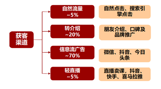• 转介绍:占比约20%,获客成本较低,转介绍比例越高,整体获客成本越低、投放效率越高。