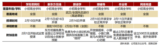• 新东方在线:为全国中小学用户免费提供100万份春季班直播课程;东方优播免费提供全国公立系统学校的