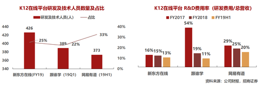 • 以学而思网校、跟谁学、新东方大班课为代表的平台,通常采用自建平台模式,研发人员占比较高,跟谁学、 新东方在线占比分别为22%、25%,网易有道此外还有在线工具类业务,研发人员占比高达33%。