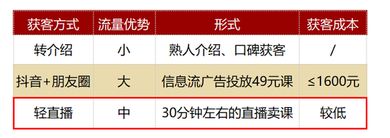 1. 获客成本低:相较于49元课模式,轻直播无需支付高昂的推广费用,成本主要来自课时费+平台费用,大大降低获客成本。
