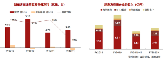 • 东方优播+K12大班课组成的K12业务为主要看点。运营大学、K12、学前三大板块业务,覆盖3-30岁全年龄段用户,旗下拥有新东方网校、东方优播、酷学多纳等多个在线平台,2020H1大学业务营收占比64%,K12业务占比23%,学前教育占比4%,机构客户收入占比10%。 • K12业务收入及付费人次占比迅速增长。公司20H1实现营收5.68亿元,同增19%,归母净利-7128万元,同降246%。