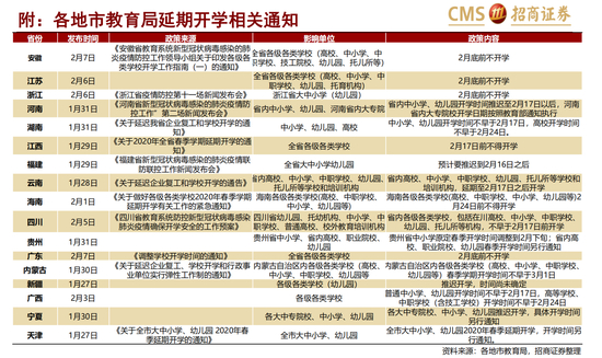 • K12:1月27日教育部发布通知,要求部属各高等学校、地方所属院校、中小学校、幼儿园等学校适当推迟春季学期开学时间,全国30多个省市陆续出台相应文件,K12阶段开学时间延期至2月底或3月初,此前不进行网上授课。
