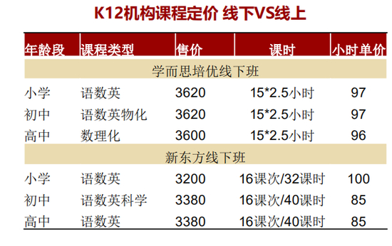 • 产品具备定价优势,兼具教学品质与性价比。相比线下K12机构平均85-100元的单小时定价,线上课程的定价平均在45-60元/小时,为线下价格的40%-50%,从课程价差来看可三个梯队:
