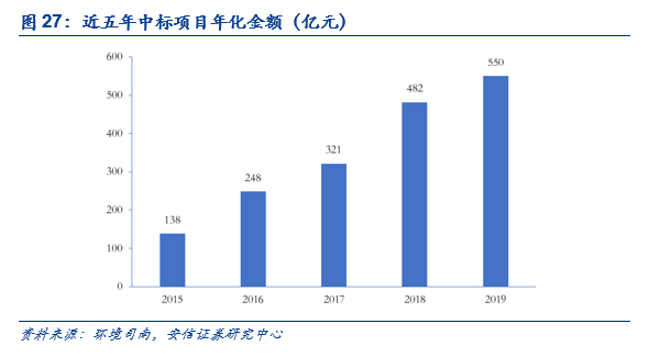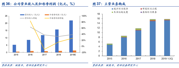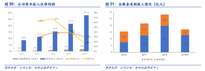 布局环卫服务,固废全产业链协同可期:政策推动下我国环卫服务市场化商业模式逐步显现,随着环卫服务市场的逐步释放,将逐渐实现政企分离,降低成本和政府财政负担,提高运作效率。我们以城乡建设统计年鉴数据为基础,参考清扫、清运、运营维护费用,由此估算城乡道路清扫保洁、城乡垃圾清运、公共设施运营服务的市场空间约1628亿。公司自进入环卫服务领域以来,环卫服务业务取得高速增长。截至2019年H1,环卫服务实现营业收入2.29亿元,同比增长68.16%,毛利率从2016的-2.35%提高至2019H1的9.12%。2019年上半年,公司签订环卫运营项目合同总金额达到57.85亿,签约能力排名全国第三,较2018年全年排名上升1个名次,成功位居行业前列。