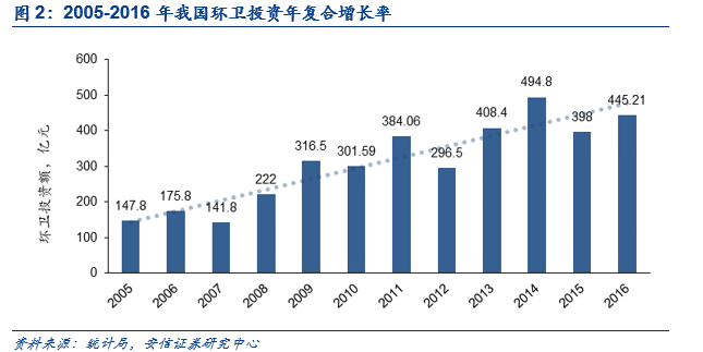 环卫作为居民生活刚性需求,市场空间未来会随着居民生活水平提高而不断扩容。长期来看,环卫服务的投入和居民收入水平和生活水平呈现正相关关系。根据城乡统计年鉴数据,2005至2016年,中国环卫投资保持了较快的增长趋势,2016年我国城市市容环境卫生投资达445.2亿元,2005年至2016年年复合增长率近11%。
