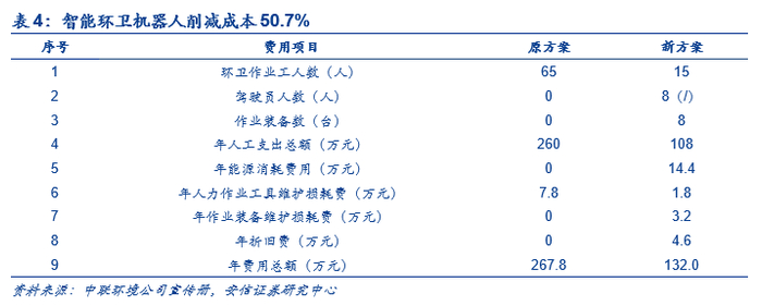 物联网产品作为数据挖掘和作业执行的主体,也是智慧环卫实现的基础。智能环卫的应用场景十分广泛,贯穿整个产业链。在垃圾运输环节,通过引入新能源车辆,实行“公交式”作业模式,定时定点上门收集,实现垃圾运输不落地;在环卫保洁环节,通过引入先进的智能化设备,包括扫路机、栏杆清扫机以及无人驾驶车辆,实行“晚上机扫+白天巡检”的24小时保洁模式;在后台监测环节,后台能通过智能环卫控制中心对全区保洁工作进行实时监控。根据中联环境的测算,环卫机器人清扫,打破传统“以人为主”的清洁模式,有望大幅降低作业成本。