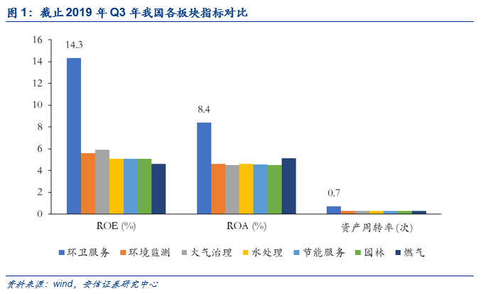 环卫服务行业具有显著的公用事业特征,同时具备垄断效应和规模效应,与其他公用事业行业例如污水处理、垃圾焚烧、电力燃气等具有相似的市场发展和竞争格局。不同的是,环卫服务行业一般采用轻资产模式,不涉及大型基建建设,主要是从项目取得到实施运营,涉及环卫装备采购以及人员培训。我们选取了A股上市公司2019年第三季度的经营数据做对比,环卫服务行业的ROE、ROA和资产周转率水平均远高于环保其他领域平均水平。