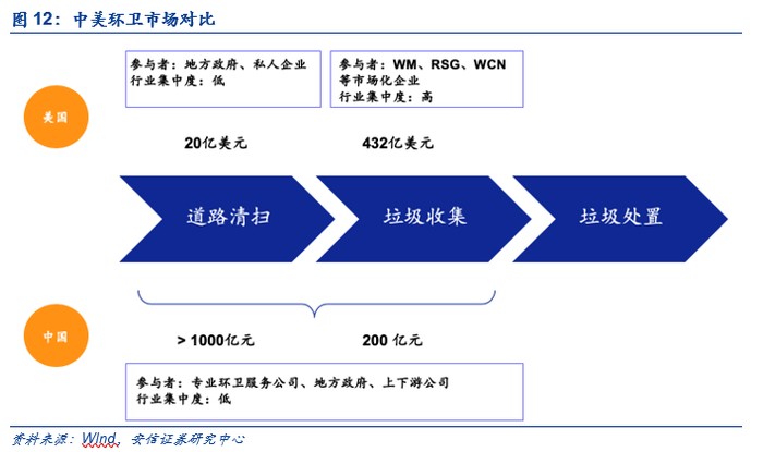 对比美国环卫市场,美国废物管理(WM.US)、共和废品处理(RSG.US)和Waste Connections(WCN.US)三大美国环卫巨头占据全美固废市场45%份额,35%市场份额为小型公司,而政府部门仅占20%的市场份额。