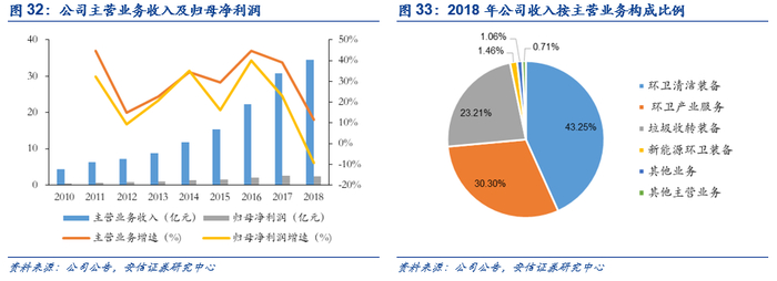专业环卫装备、环卫服务领域的重要供应商。公司成立于2000年,是集城乡环境卫生系统规划设计、环卫装备研发制造销售、环卫运营、投资为一体的环境卫生整体解决方案提供商。公司环卫装备业务涵盖智能环卫机器人、无人驾驶环卫车、清扫车、洗扫车、高压清洗车、压缩式垃圾车、垃圾转运车、餐厨垃圾车、垃圾站设备、垃圾分类设备、市政园林设备、除冰雪设备、渗滤液及污水处理设备等,约400个型号的产品。公司制定了“环卫装备制造+环卫服务产业”协同发展的战略。公司现已形成较为全面的产品系列,可广泛满足客户需求。2016-2018年实现营业收入22.18、30.84、34.43亿元,归母净利润2.11、2.60、2.36亿元。