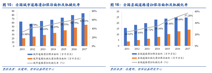 机械化率稳步提升。根据城乡建设统计年鉴,截至2017年,全国城市道路清扫保洁面积为84.20亿平方千米,其中机械化清扫面积为54.7亿平方千米,机械化率为65.0%,全国县城道路清扫保洁面积为24.8亿平方千米,其中机械化清扫面积为14.18亿平方千米,机械化率为57.3%,机械化率呈现稳步提升趋势。2018年7月,国务院印发《打赢蓝天保卫战三年行动计划》,计划提出大力推进道路清扫保洁机械化作业,提高道路机械化清扫率,2020年底前,地级及以上城市建成区达到70%以上,县城达到60%以上,重点区域要显著提高。相比欧美发达国家,其环卫行业机械化率普遍达到80%以上,再加上随着老龄化以及清扫意愿的下降,机械替代人力清扫有望持续,环卫机械化率水平仍有较大提升空间。
